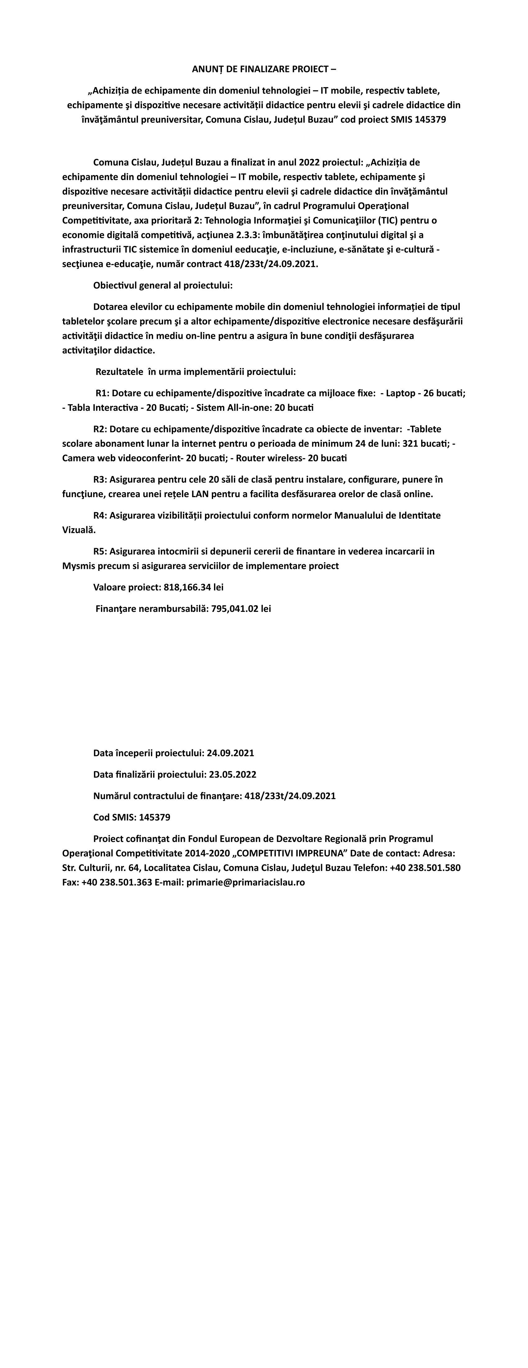 Anunt finalizare proiect